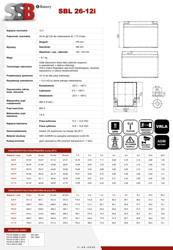 SSB SBL 26-12i – akumulator kwasowo-ołowiowy, szczelny, bezobsługowy, wykonany w technologii AGM  (z ang. Absorptive Glass Matt). Pojemność 18Ah, napięcie 12V,żywotność projektowa 10-12 lat.