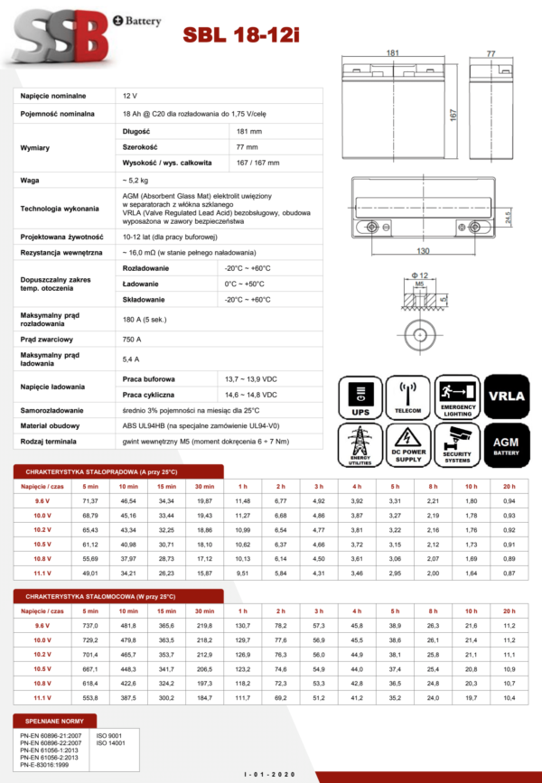 SSB SBL 18-12i – akumulator kwasowo-ołowiowy, szczelny, bezobsługowy, wykonany w technologii AGM (z ang. Absorptive Glass Matt). Pojemność 18Ah, napięcie 12V,żywotność projektowa 10-12 lat.