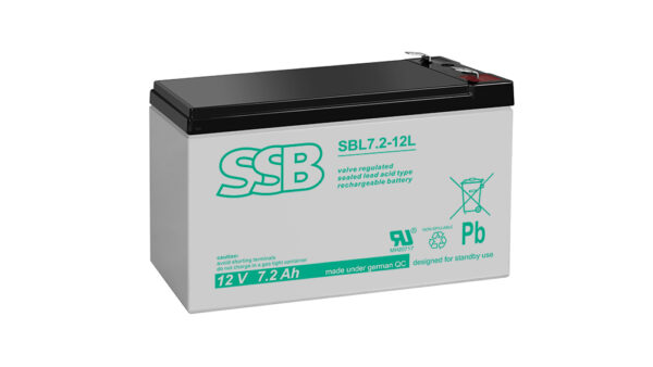 SSB SBL 7,2-12L – akumulator kwasowo-ołowiowy, szczelny, bezobsługowy, wykonany w technologii AGM (z ang. Absorptive Glass Matt). Pojemność 7,2Ah, napięcie 12V, żywotność projektowa 10-12 lat.