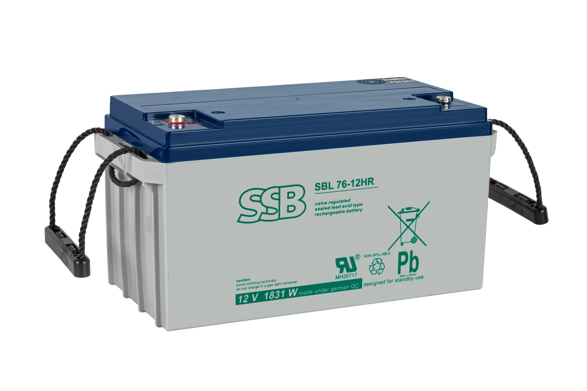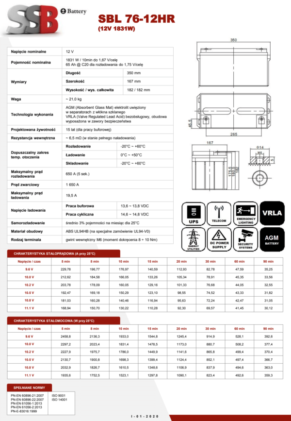 SSB SBL 76-12HR – akumulator kwasowo-ołowiowy, szczelny, bezobsługowy, wykonany w technologii AGM  (z ang. Absorptive Glass Matt). Pojemność 65Ah, napięcie 12V,żywotność projektowa 15 lat.