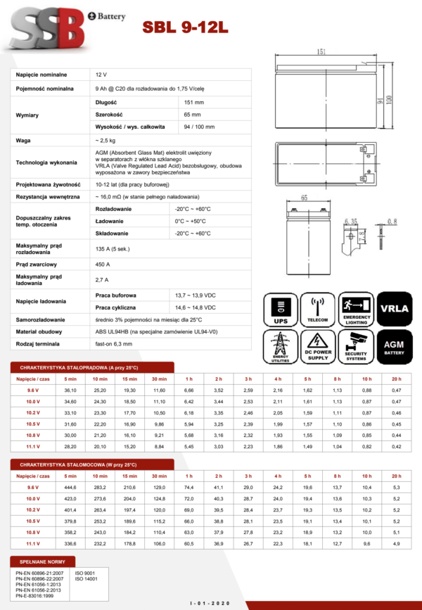 SSB SBL 9-12L – akumulator kwasowo-ołowiowy, szczelny, bezobsługowy, wykonany w technologii AGM (z ang. Absorptive Glass Matt). Pojemność 9Ah, napięcie 12V, żywotność projektowa 10-12 lat.
