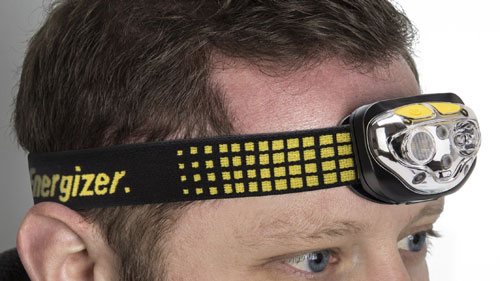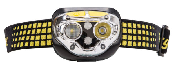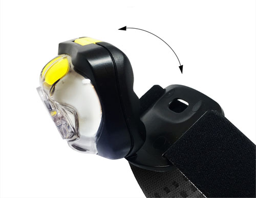 Latarka czołowa z 4 diodami – z odchylaną głowicą co pozwala na dowolne skierowanie światła przed siebie lub wprost pod nogi (lub np. na blat roboczy).