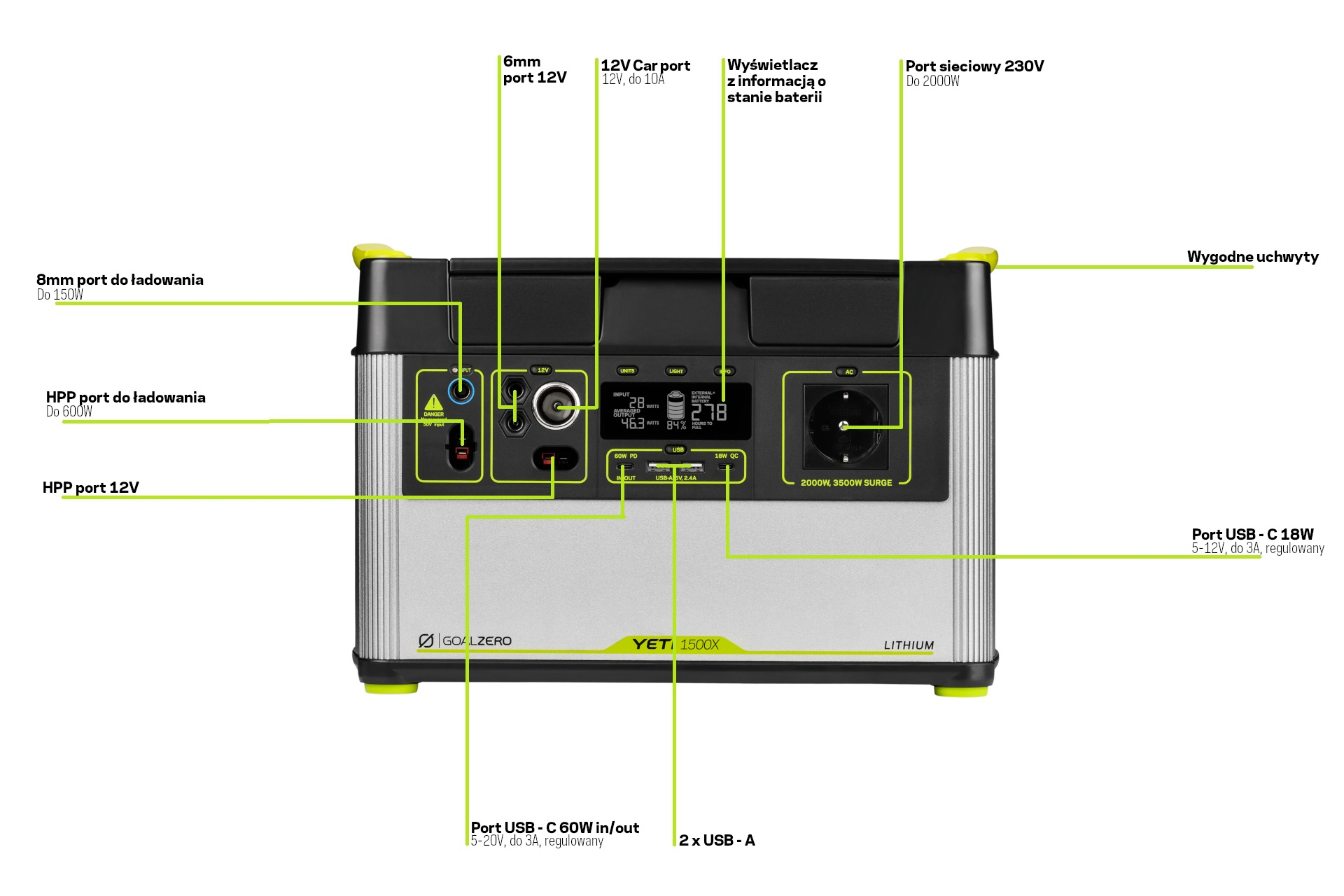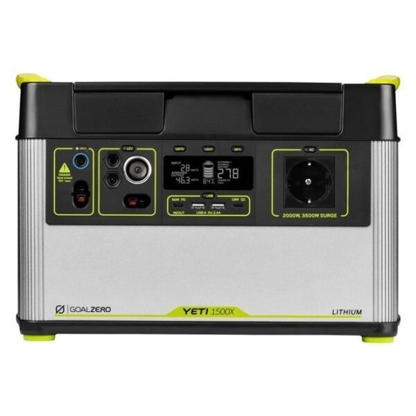 Stacja zasilania Goal Zero Yeti 1500 X daje Ci olbrzymie możliwości. Wyposażona w gniazdo sieciowe 230V, 12V oraz 4 porty USB ( 2x USB-A, 1x USB-C i 1x USB-PD) sprawia, że możemy zasilić wszystko czego potrzebujesz. Jednocześnie możesz zasilać kilkanaście urządzeń! Sprzęt RTV, AGD, piec gazowy, sprzęt medyczny, a nawet elektronarzędzia. Wszystko stworzone w systemie Plug&Play, tak aby jedyne co Cię interesowało to włożyć wtyczkę do odpowiedniego portu.