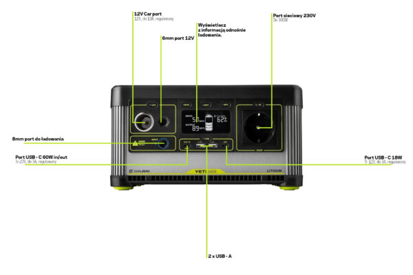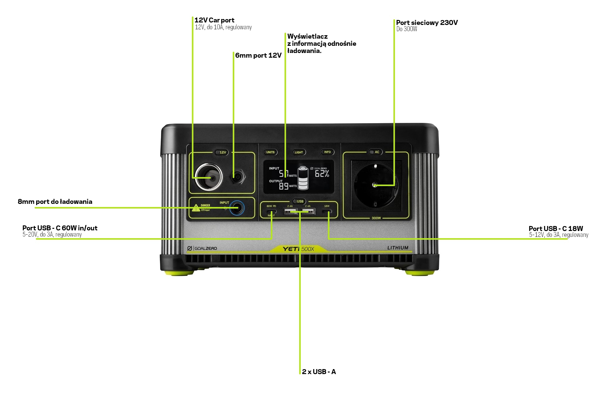 Stacja zasilania GOAL ZERO YETI 500 X daje Ci wiele możliwości. Wyposażona w gniazdo sieciowe 230V, 12V oraz 4 porty USB ( 2x USB-A, 1x USB-C i 1x USB-PD) sprawia, że możemy zasilić wszystko czego potrzebujesz. Jednocześnie możesz zasilać kilka urządzeń! Laptopy, smartfony, drony, aparaty i wiele innych rozwiązań elektroniki użytkowej. Sprzęt medyczny, lodówki turystyczne i radiotelefony. Wszystko stworzone w systemie Plug&Play, tak aby jedyne co Cię interesowało to włożyć wtyczkę do odpowiedniego portu